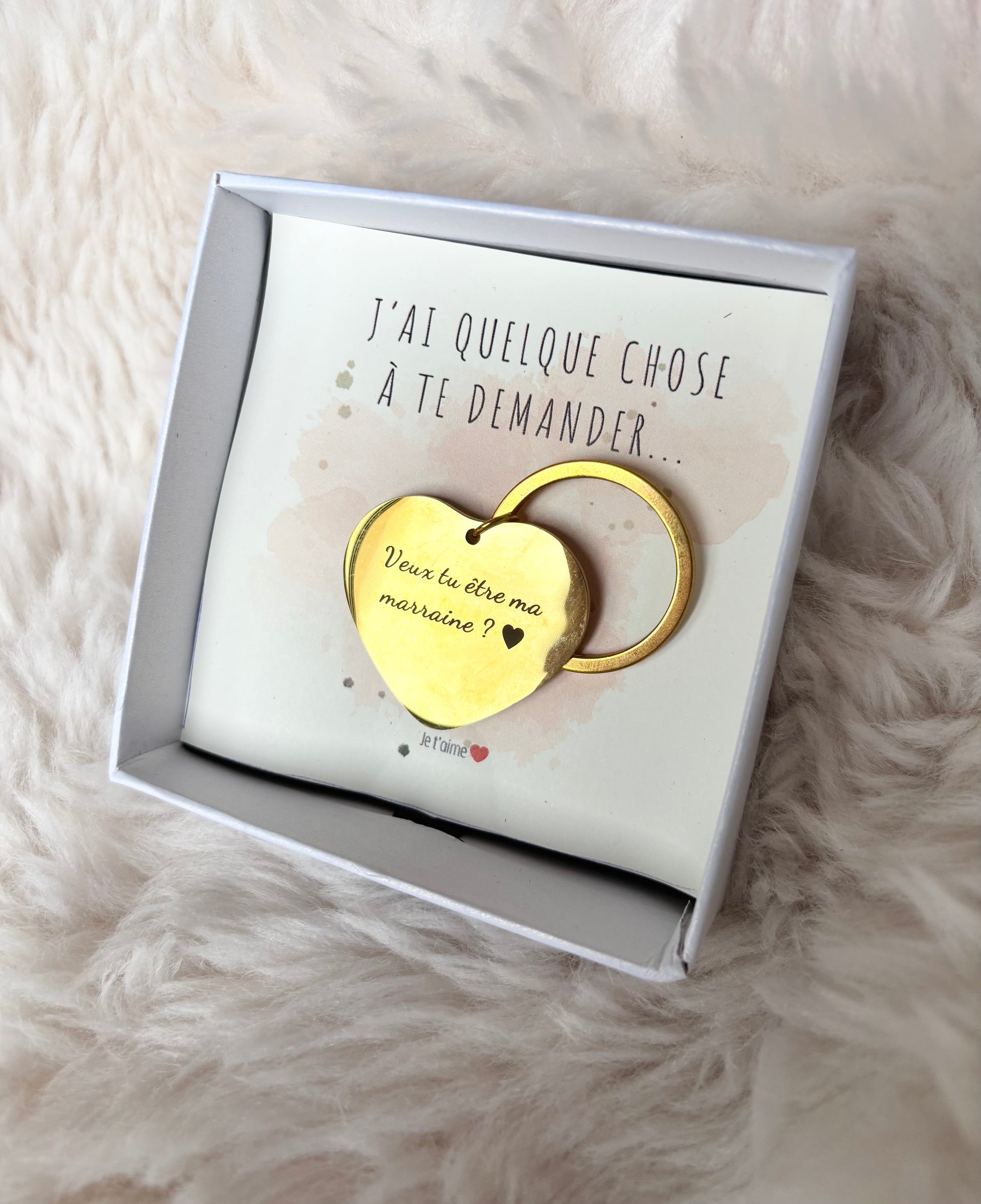 Ce joli porte-clés en forme de cœur doré gravé “Veux-tu être ma marraine ?” est la manière la plus douce et originale de poser cette question si spéciale.