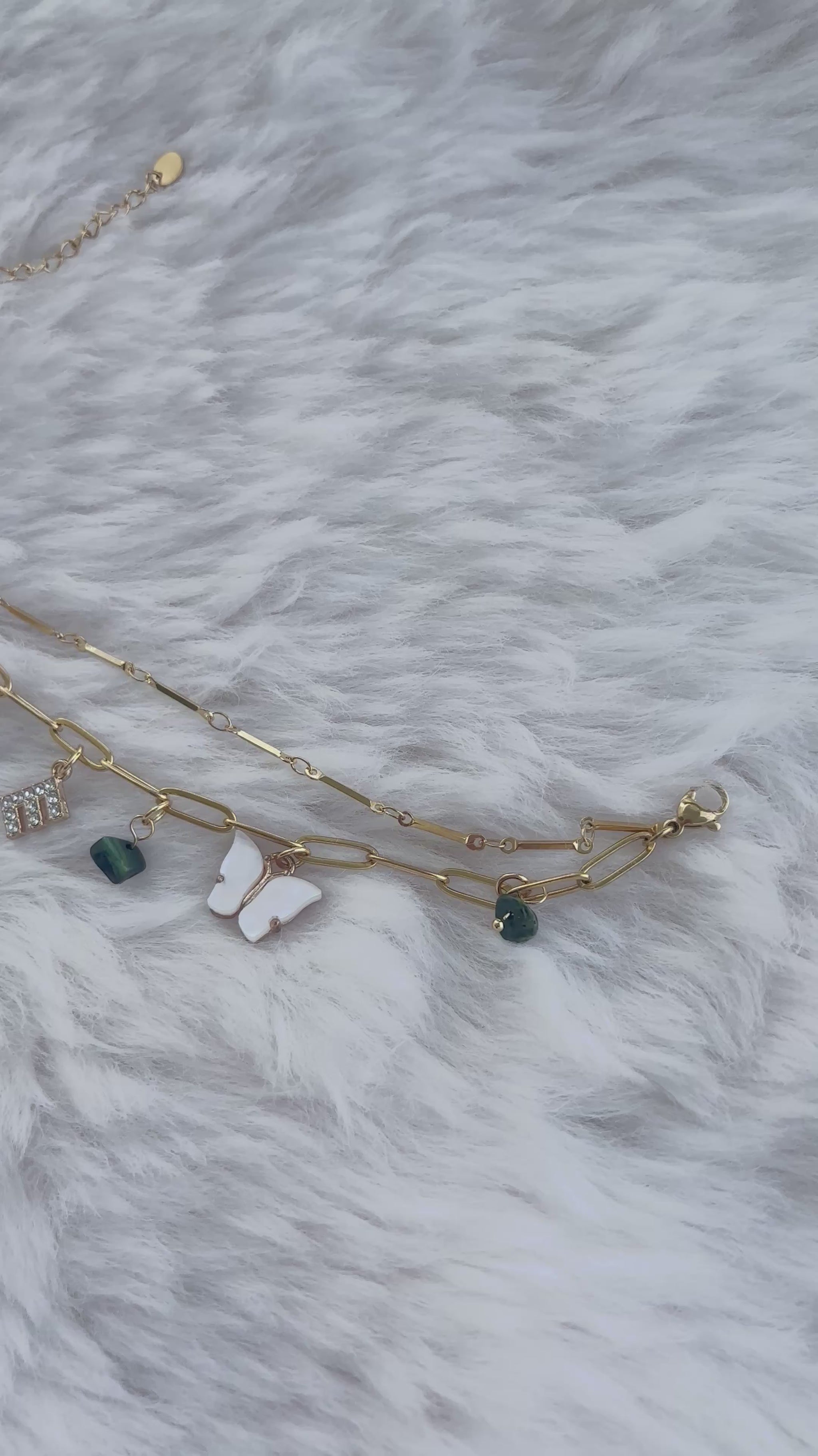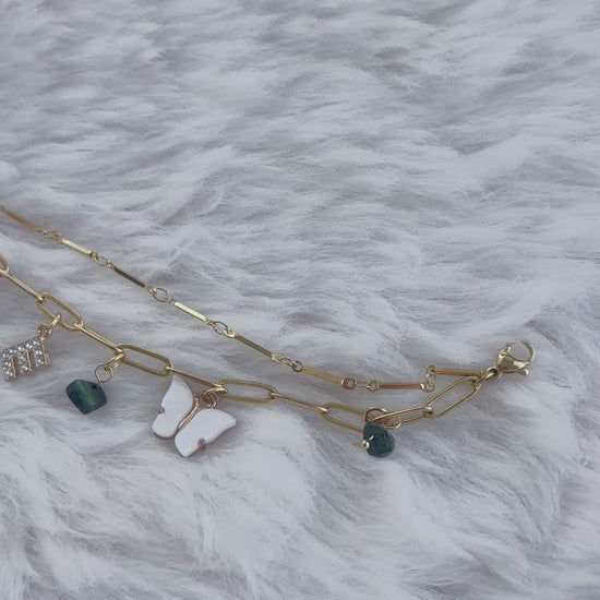 Laissez-vous séduire par ce bracelet raffiné à l’esprit nature et élégance. Sa chaîne dorée à maillons fins est ornée de pendentifs délicats :
