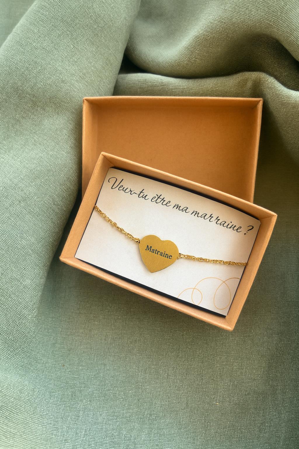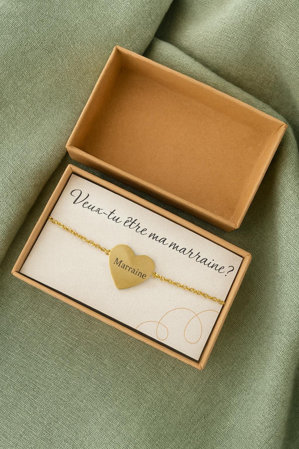 À son ouverture, la future marraine découvre un message rempli d’émotion : « Veux-tu être ma marraine ? » accompagné d’un délicat bracelet souvenir. ✨