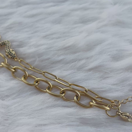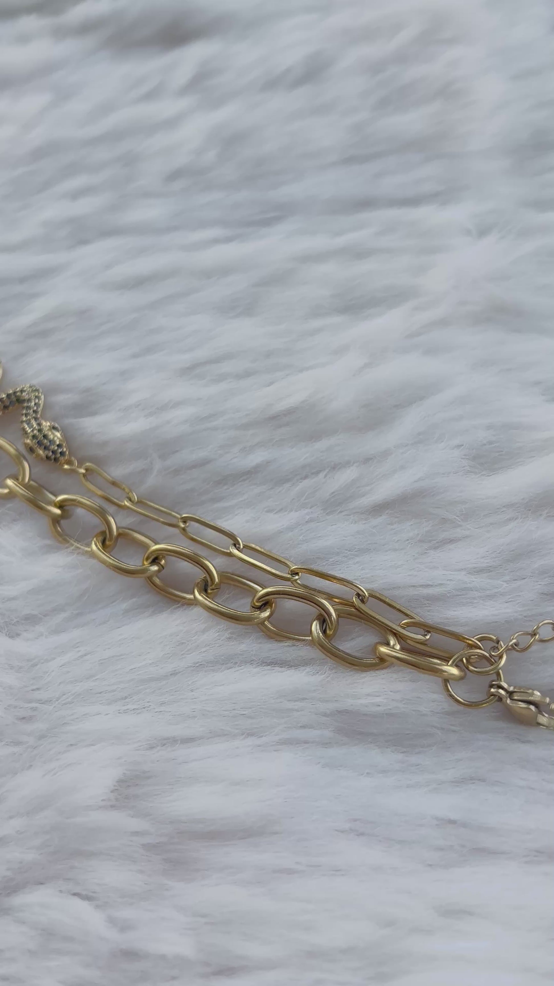 Affirmez votre style avec ce bracelet 2-en-1 au design unique. Ses deux chaînes dorées, ornées de perles et d’un pendentif serpent noir scintillant, créent un effet tendance et audacieux en un seul bijou.