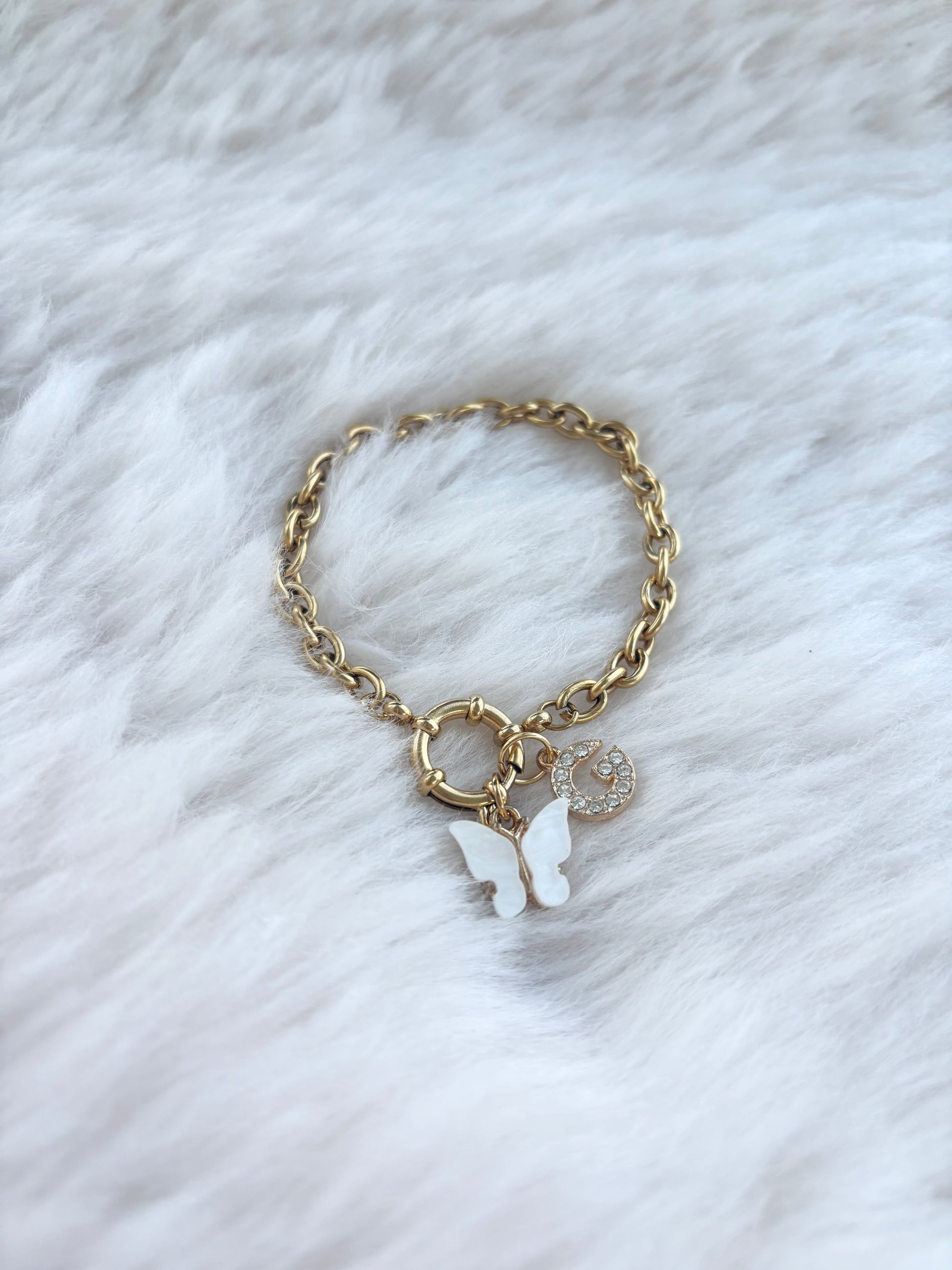 Sublimez votre poignet avec ce bracelet raffiné en chaîne dorée, orné de deux pendentifs :