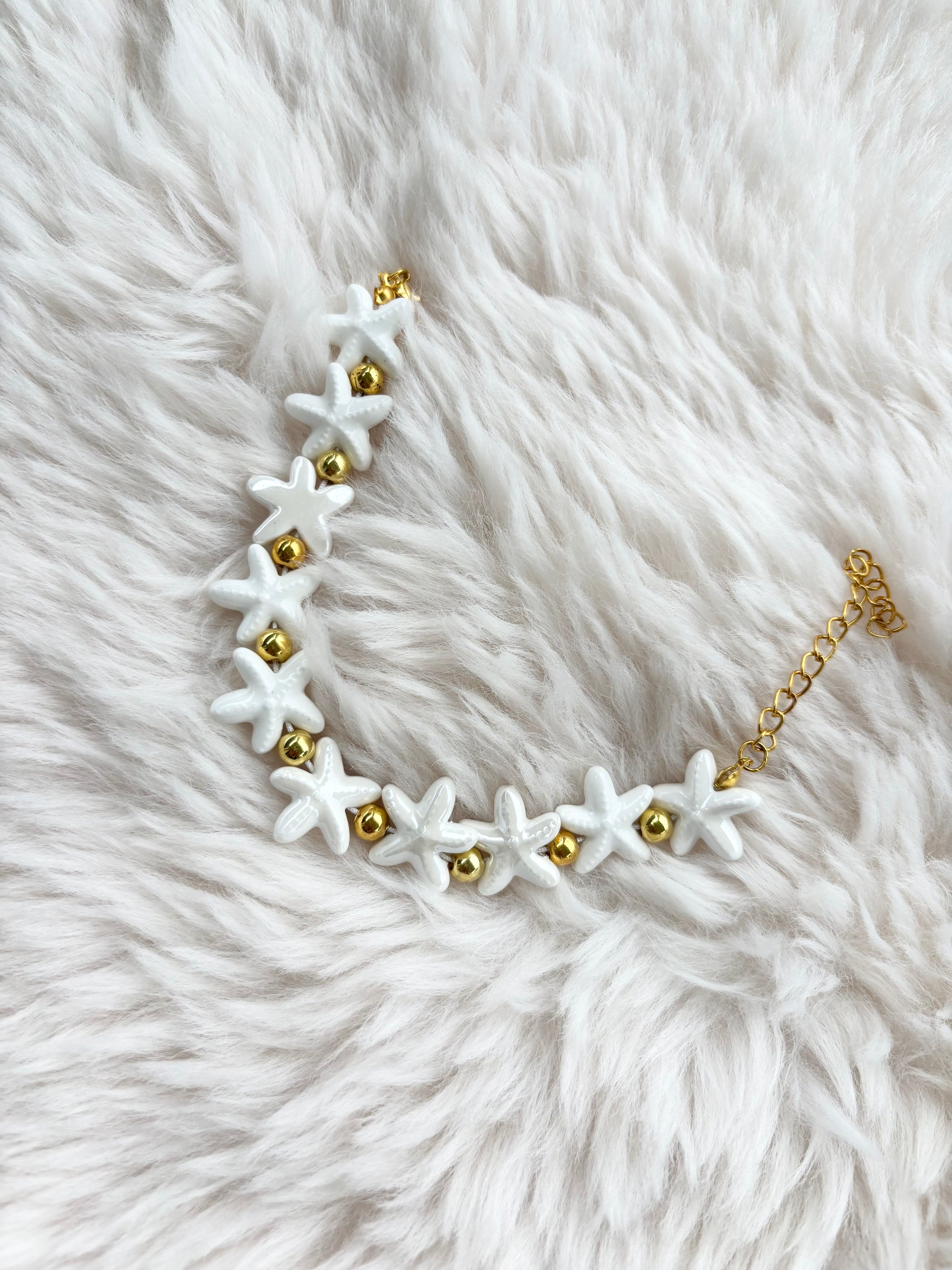 Craquez pour ce bijou raffiné composé d’un collier et d’un bracelet assorti. Ses perles en forme d’étoiles blanches, associées aux perles dorées, apportent une touche élégante et originale à vos tenues.