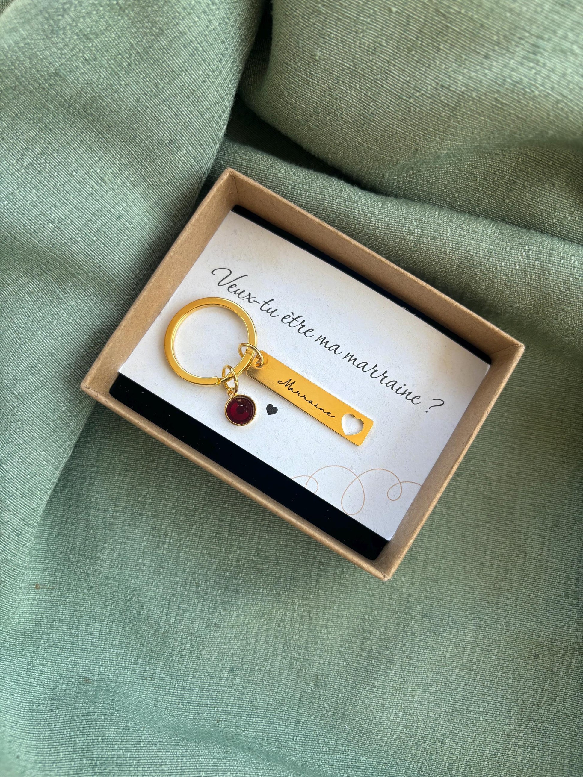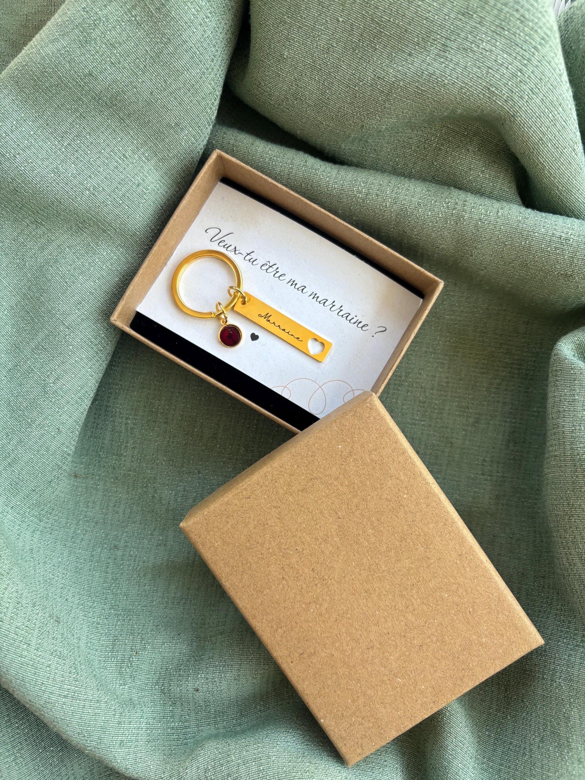 Offrez un moment unique et plein d’émotion avec ce porte-clés souvenir présenté dans une élégante boîte cadeau, accompagné d’une carte au message tendre « Veux-tu être ma marraine ? » 💌