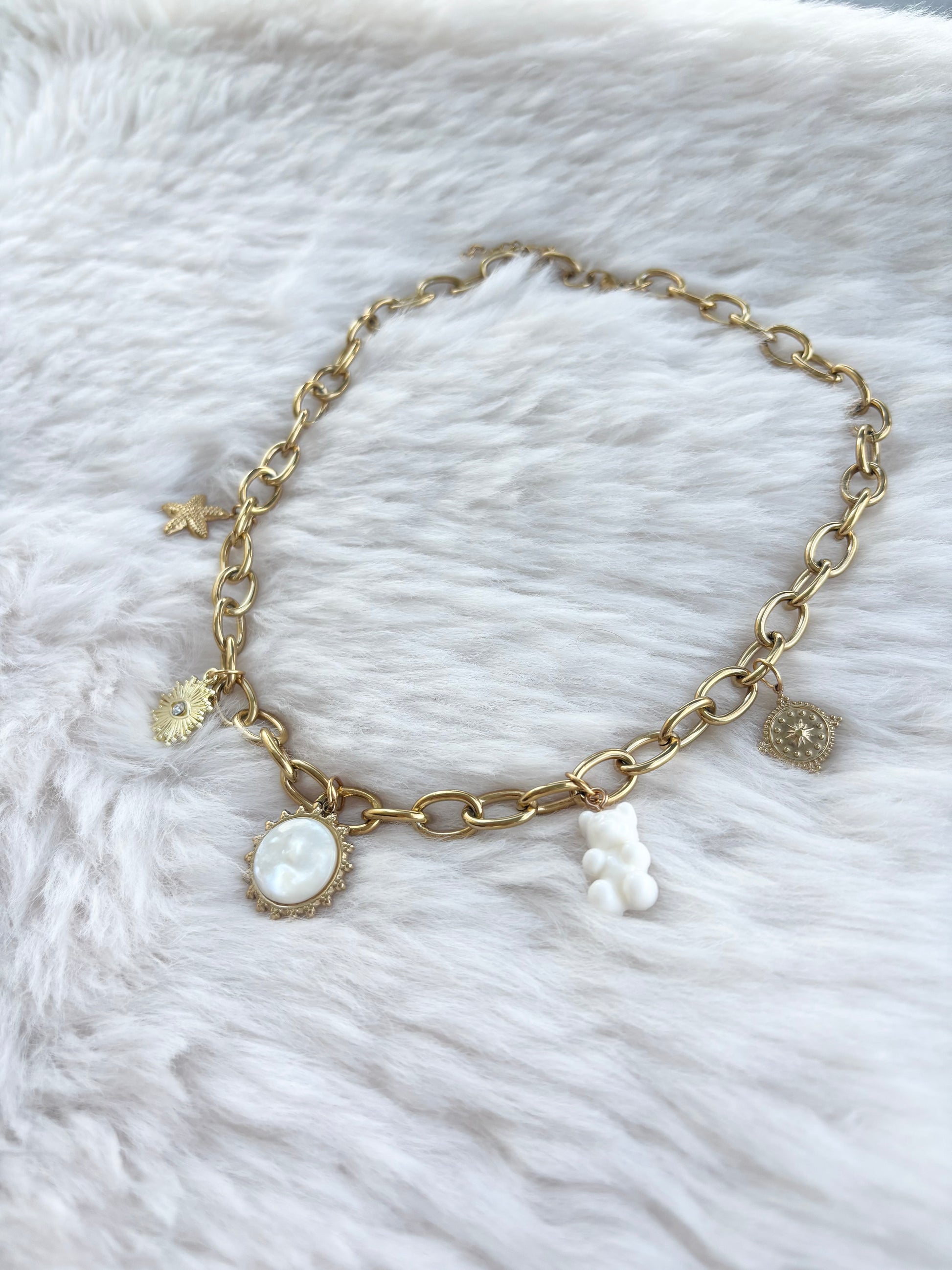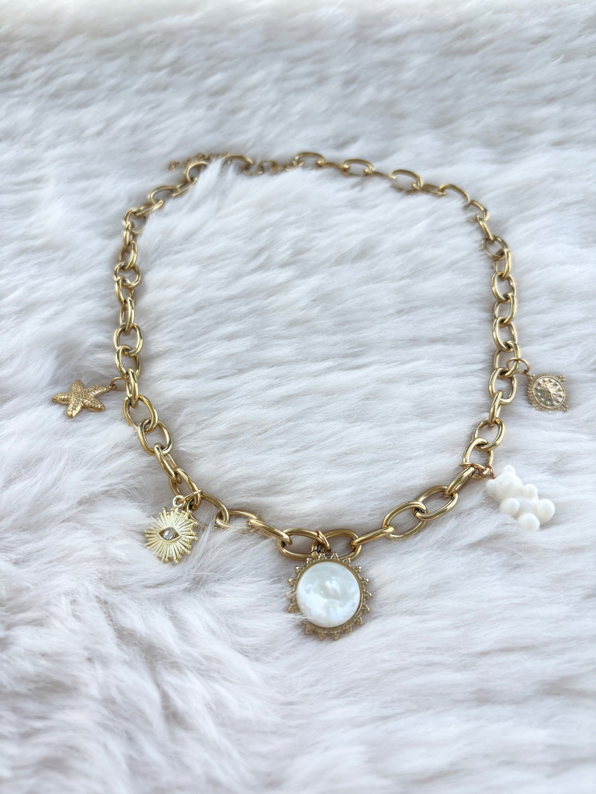 Apportez éclat et élégance à vos tenues avec ce collier doré à gros maillons, sublimé par des pendentifs raffinés :